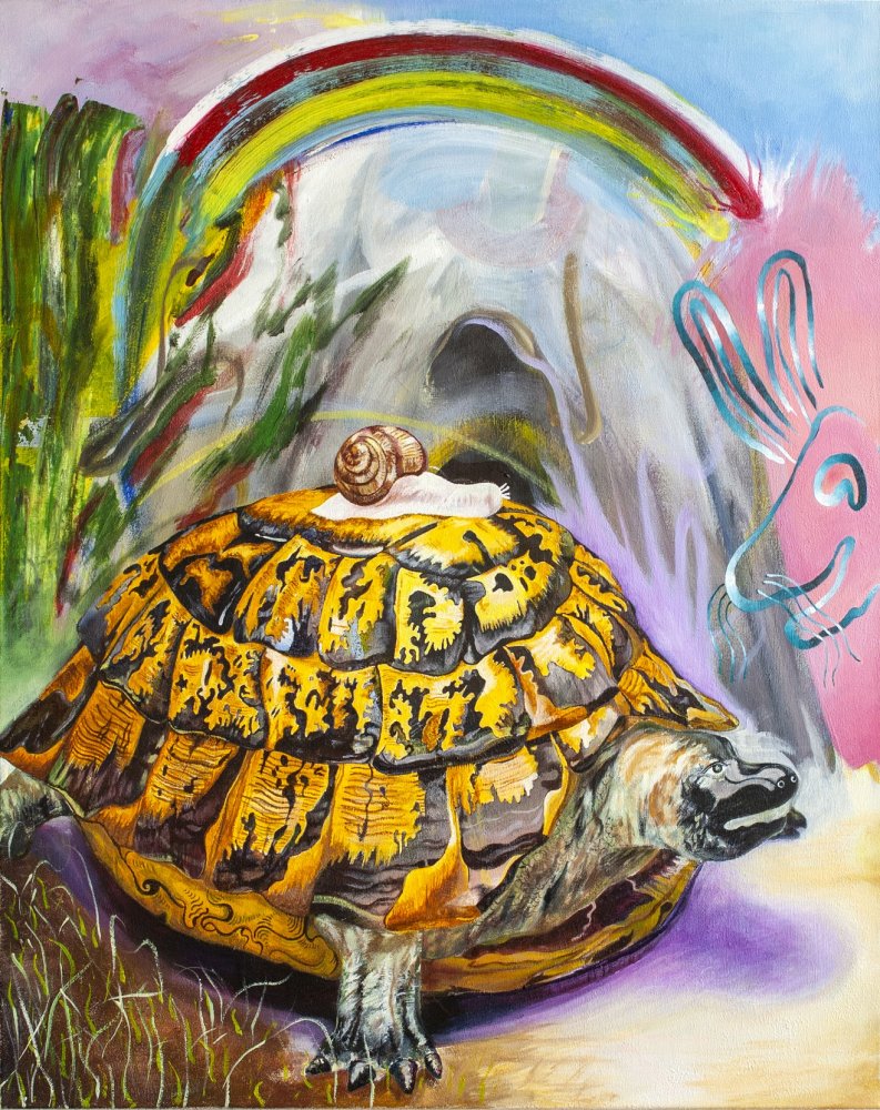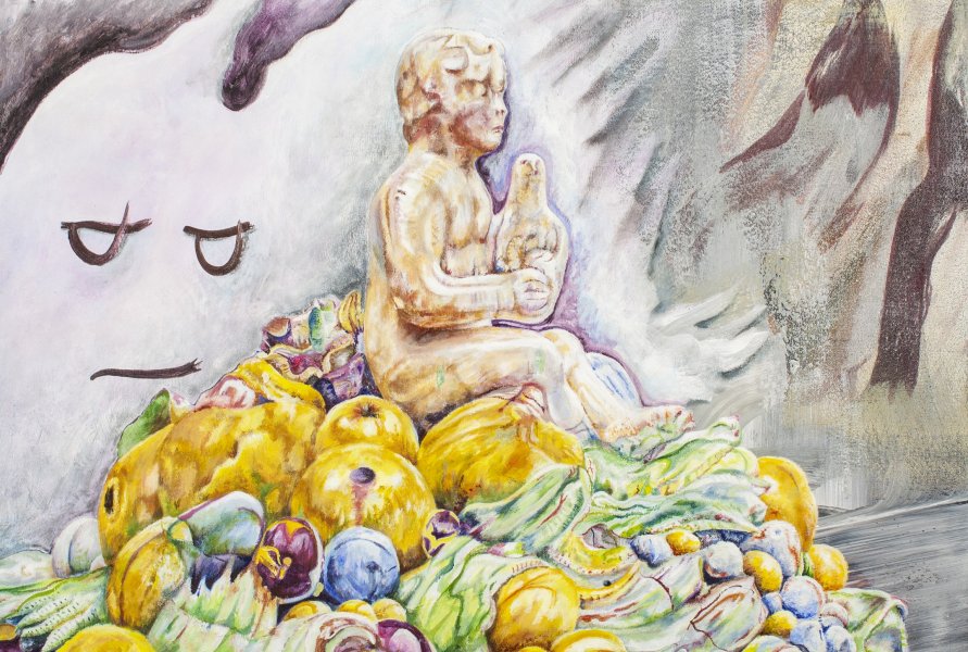 La peinture de Gabriel Nunige prend sa source dans les bas-reliefs des cathédrales, les enluminures, la Renaissance nordique, les bestiaires infernaux, la vaisselle ornementée, la littérature fantasy. Il en isole et déforme certains éléments afin de construire patiemment un espace onirique, qui prend la forme d’étranges artefacts, de plantes biscornues, de tentatives de larcin. Depuis 2020, son travail s’est solidifié autour d’une mise en images de la légende de Saint-Christophe, qui met en lumière quelques éléments qui lui tiennent particulièrement à cœur : la place de l’individu par rapport à la société, la difficulté à faire le «bon» choix, le chaos organisé du monde, la grandiloquence des postures héroïques.