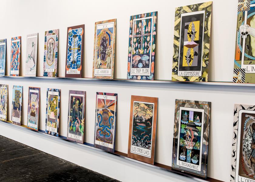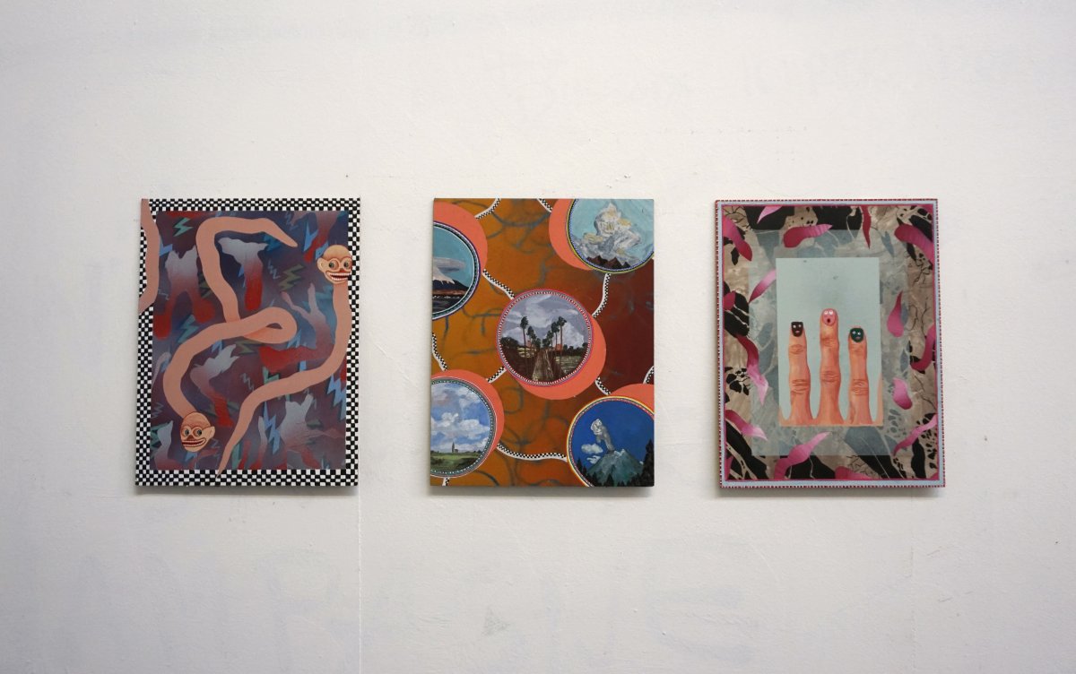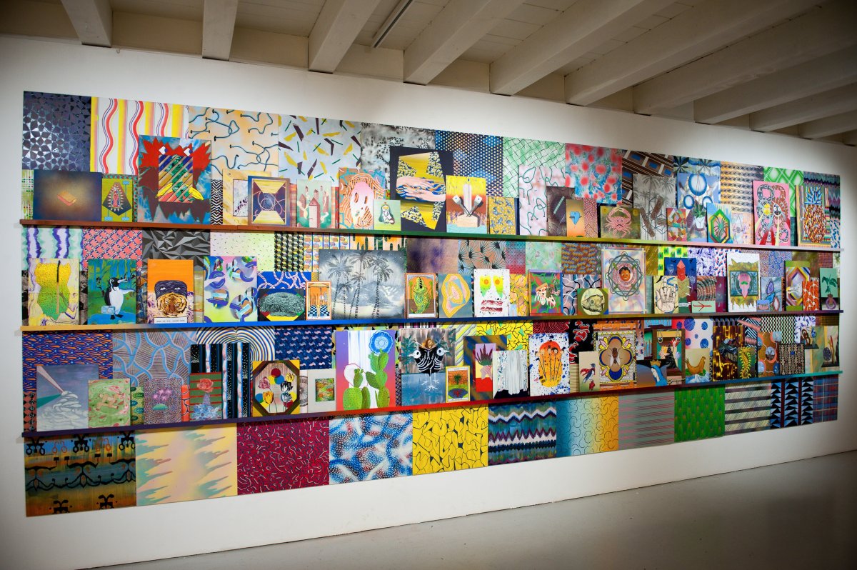 Nées en 1986 et 1984, Laura Thiong-Toye et Isabelle Racine travaillent en duo depuis 2010 et sont diplômées de la HEAD. Motifs décoratifs ou abstraits, sujets profanes et religieux, savants et populaires composent de petits tableaux sur bois, souvent recto verso posés sur des étagères. Les peintures sont la synthèse d’une pratique quotidienne d’accumulation d’informations empruntées au monde environnent. Classées en inventaire de formes et de sujets, ces idées sont remaniées et retranscrites pour être finalement proposées comme des réminiscences d’impression ou des citations. Exercice de flatterie d’oeuvres et d’artistes qui servent de références, les tableaux mettent en avant l’élément repris, tout en le dénaturant par la facture et le dispositif d’accrochage.La notion de surenchère présente est induite par le travail en duo. Ce que l’une fait l’autre le complète, l’efface, le détourne ou y répond avec pour seuls mots d’ordre, désinvolture et émulation.