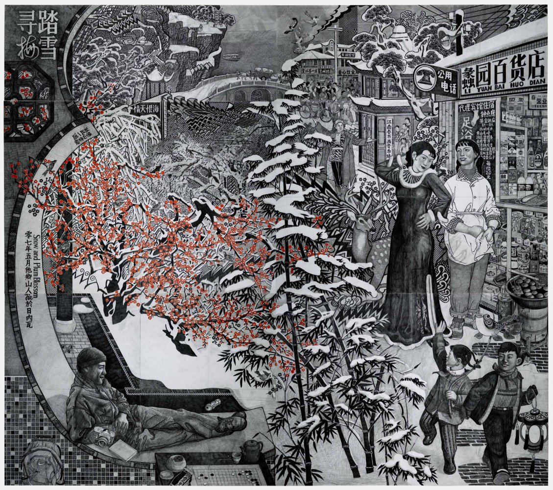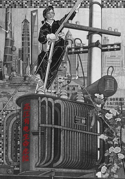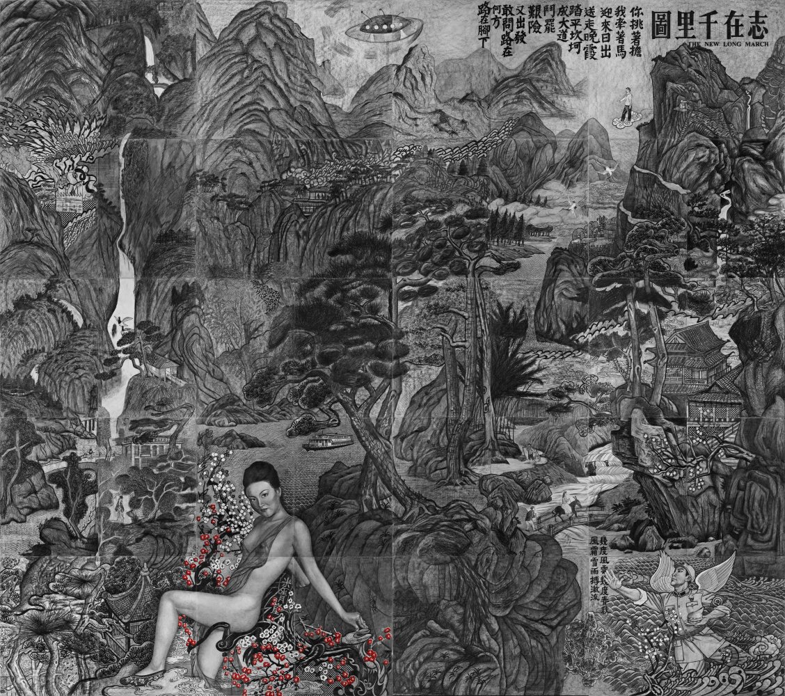 Élevé durant la Révolution Culturelle, Qiu Jie reproduit des images de propagande de soldats, d'ouvriers et d'agriculteurs issues des journaux locaux. Son art puise à cette source du réalisme socialiste chinois et ses études en multimédia à Genève. Les dessins au crayon de Qiu Jie confrontent l'histoire de la société chinoise et la culture occidentale contemporaine, le photoréalisme occidental et la propagande socialiste, la perspective traditionnelle et la calligraphie. Son esthétique noir et blanc vient délicatement se mêler à des taches éparses de rouge, non sans rappeler la couleur phare des dazibao de la Révolution Culturelle en Chine. La couleur rouge rappelle également l'encouragement de Mao Zedong à moderniser la peinture à l'encre durant les années 1950. Qiu Jie signe ses œuvres avec les caractères Ta xiang shan ren, « L’homme qui vient d’autres montagnes ».