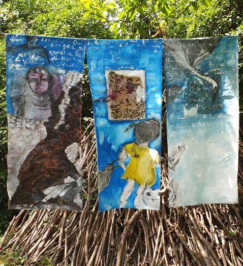 Des animaux et des hommes pour célébrer la vie et ses déchirures, des techniques mixtes et des expériences avec divers matériaux et supports.