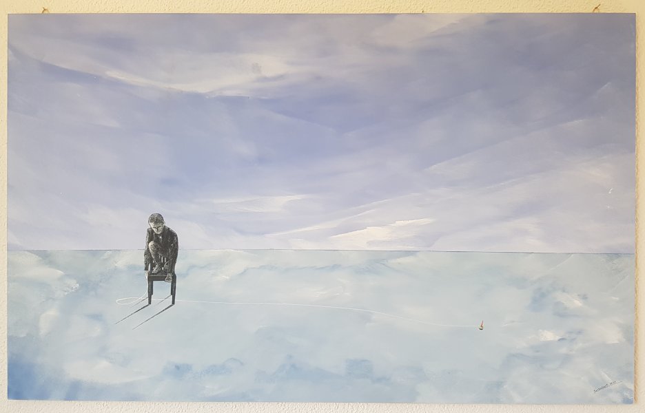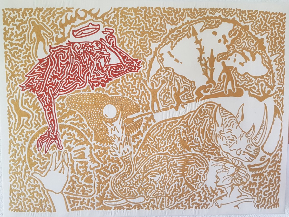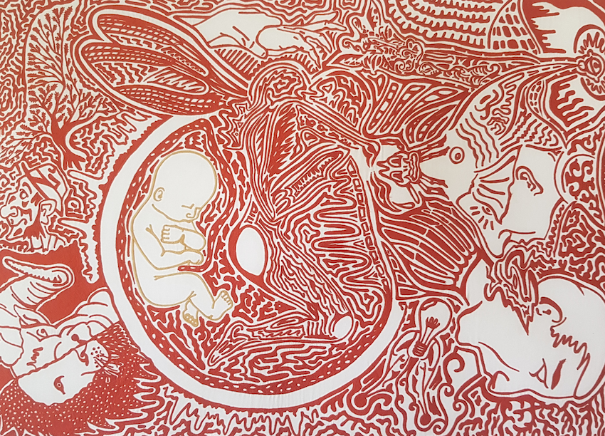 Reto Purtschert crée des images en broderies surréalistes basées sur ses propres dessins ainsi que des sculptures en fil de fer.