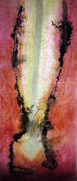 Très vite est venu l’intervention de la lumière à travers le papier, donnant une autre dimension, révélant la profondeur intérieure, comme notre propre lumière intérieure révèle notre beauté de vie. Le format est de 2,50m de haut sur 1m de large, suspendu et flottant à l’aide d’une structure métallique fine et discrète, une source de lumière éclaire le papier depuis derrière.